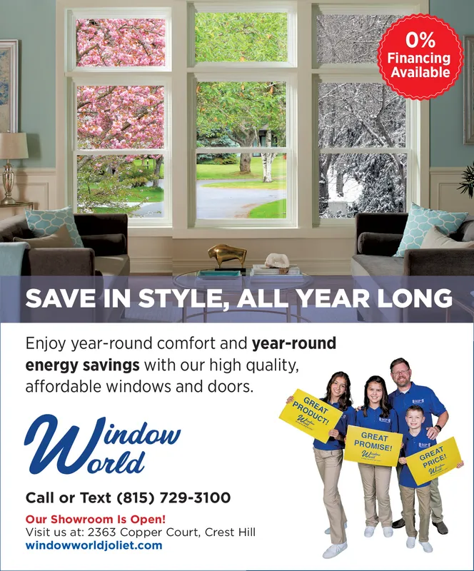 0% Financing Available SAVE IN STYLE, ALL YEAR LONG Enjoy year-round comfort and year-round energy savings with our high quality, affordable windows and doors. GREAT PRODUCT! lindow orld GREAT PROMISE! GREAT PRICE! Call or Text (815) 729-3100 Our Showroom Is Open! Visit us at: 2363 Copper Court, Crest Hill windowworldjoliet.com 0% Financing Available SAVE IN STYLE, ALL YEAR LONG Enjoy year-round comfort and year-round energy savings with our high quality, affordable windows and doors. GREAT PRODUCT! lindow orld GREAT PROMISE! GREAT PRICE! Call or Text (815) 729-3100 Our Showroom Is Open! Visit us at: 2363 Copper Court, Crest Hill windowworldjoliet.com